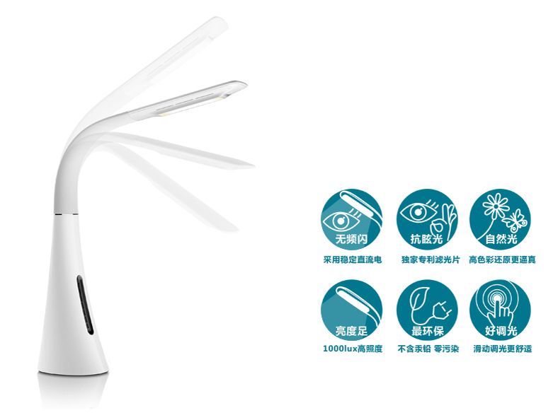 易視界產(chǎn)品親子智能護(hù)眼臺(tái)燈全新LED面光源,顏色逼真更護(hù)眼,光照效果更集中明亮;觸摸指示背景燈,優(yōu)雅靈動(dòng)操控體驗(yàn);高靈敏滑動(dòng)觸摸按鍵,滑動(dòng)調(diào)光;七級(jí)LED燈光亮度調(diào)節(jié),適應(yīng)各種照明要求;產(chǎn)品收納方便,軟管燈臂設(shè)計(jì),更容易調(diào)整到需要的優(yōu)質(zhì)角度;光源不含鎢、汞等有毒金屬,低碳環(huán)保。榮獲歐盟CE認(rèn)證!歐盟RoSH認(rèn)證!及國家技術(shù)專利!